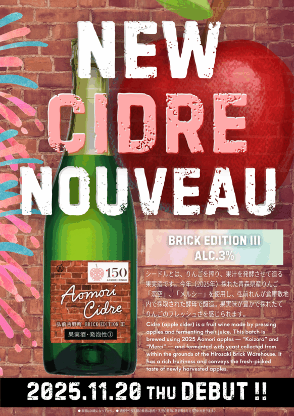 TOP ニュース フロアガイド アオモリシードル アオモリミヤゲ 営業時間・施設案内 アクセス・駐車場 決済方法 大口・ギフト注文 FAQ お問い合わせ 会社案内 個人情報の保護について JR東日本グループコンプライアンス相談窓口 ウェブサイトのご利用について ソーシャルメディアポリシー ホーム ニュース 今年採れたりんごで醸造したシードルヌーヴォついに発売! 今年採れたりんごで醸造したシードルヌーヴォついに発売! 2025/11/20(木) 今年2025年に採れた青森県産りんご「恋空」と「メルシー」を使用し、弘前れんが倉庫敷地内で採取された「吉野町れんが酵母」で醸造した特別なシードルです。 一覧へ